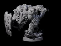This imposing humanoid miniature showcases exceptional detail in its heavily armored frame, featuring distinctive plates and spikes across its muscular form. The forward-leaning combat stance, combined with a massive spiked shield and raised club, captures the essence of a formidable defender. Notable features include prominent claws, a ridged back, impressive tusks, and a pronounced jaw that emphasize its reptilian heritage. The detailed rocky terrain base provides a stable foundation for this powerful TTRPG centerpiece.