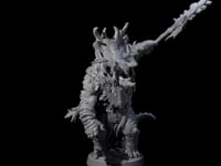 This detailed miniature captures the raw power of a humanoid hunter, featuring a muscular frame enhanced by rugged armor and tactical straps. The figure's dynamic pose shows it poised with a raised spear, while characteristic features like clawed hands and a powerful tail emphasize its predatory nature. Sculpted on a textured circular base suggesting rocky terrain, this figure offers painters and gamemasters a striking representation of a Lizardfolk warrior for tabletop encounters.