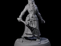 This fallen soldier stands ready for battle despite her undead state. Her tattered military garments and weathered armor tell tales of past conflicts. She grips a short blade with grim determination, her hollow gaze fixed on some distant threat. Perfect for horror campaigns or undead encounters.