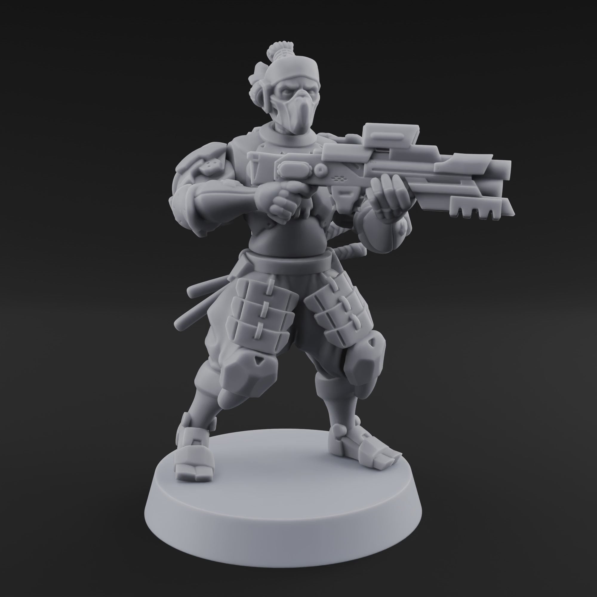 Feet planted in a wide combat stance, this cyber ninja levels a heavy-duty assault rifle with cold, calculated precision. A tactical respirator masks his face beneath a swept-back topknot, while armored pouches, ammo carriers, and a sheathed blade line his reinforced combat gear — every detail rendered with razor-sharp fidelity that rewards close inspection.