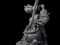 The Spicy Ogre Cook is a striking miniature, showcasing an imposing ogre with muscular arms wielding a massive, intricately designed battlespoon. His broad shoulders and fierce facial expression convey a mix of ferocity and culinary passion, while the bubbling cauldron below him hints at the magical concoctions he brews. The miniature's detailed features, from the chaotic mix of herbs and ingredients within the cauldron to the textured scars on the ogre's skin, make it a standout piece for any fantasy tabletop game.