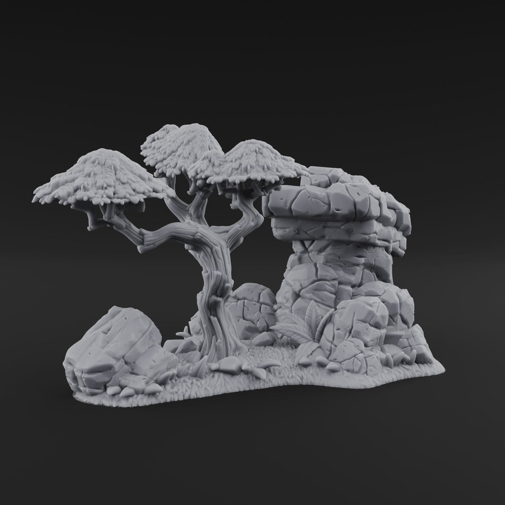 On the tabletop, this outcrop is a natural ambush point — bandits lurking behind the rock face, a lion pride resting in the shade, or a druid's sacred grove marking the boundary of wild territory. The stacked stone blocks solid line of sight while the tree canopy provides partial concealment, making it a tactically rich piece for skirmish games and wargaming alike. Place it as a waypoint in an overland D&D or Pathfinder journey, a sniper's perch in a Forbidden Lands hex crawl, or cluster it with other scatter pieces to build a sprawling savannah landscape your players won't forget.