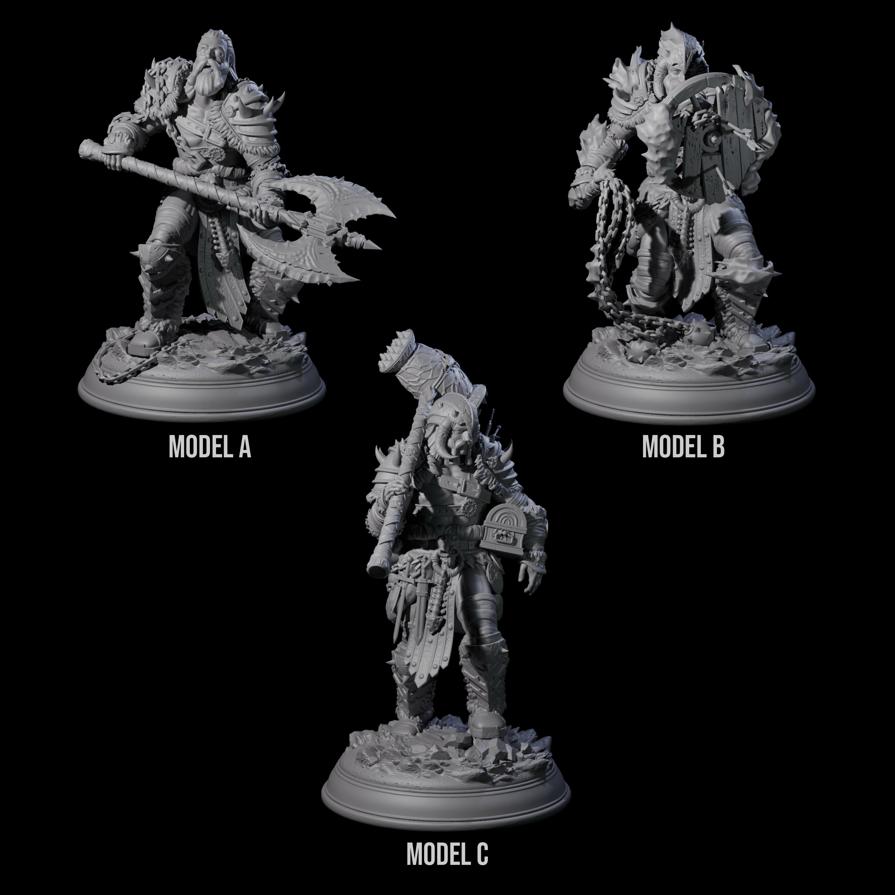 This Trio of Frost Giants brings glacial terror to your tabletop, each with a unique design that captures the essence of brutal, ice-bound warriors. Model A wields a massive, barbed axe with the strength to cleave through any foe, its icy details suggesting enchantments born from ancient glaciers. Model B stands as a nearly impenetrable fortress, armored and shielded, with a chain weapon ready to entrap or crush anything in its path. Meanwhile, Model C brings a sinister presence with a war chest strapped to his back and a grim gaze, perhaps a spellcaster or siege specialist, prepared to unleash terrible frost-based attacks on those who dare cross his path.