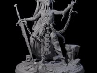 The Chainbound Kyton Priestess A miniature is a stunning blend of dark mysticism and intricate craftsmanship. Standing at a significant 75mm, this figure commands attention with her flowing, lifelike hair and ornate, ritualistic attire. Her armor is a masterpiece of swirling patterns and arcane symbols, emphasizing her status as a powerful magical figure. Every detail, from the menacing chains to the coiling serpent staff, is meticulously crafted to enhance the miniature's ethereal and commanding presence.