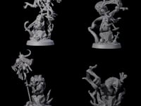 These Kenku shamans feature elongated limbs in contorted poses, with arms raised and fingers splayed in expressive gestures. Vine-like tendrils weave around their forms, emerging from detailed circular bases that showcase organic terrain. Each miniature includes intricate sculptural elements, from their distinctive bird-like features to the mysterious partially engulfed forms at their feet, making them perfect for mystical encounters or character collections.