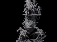 This detailed terrain piece features a battle-worn tower structure with multiple combat platforms, bringing vertical drama to any encounter. Demon Prince cultists are sculpted in dynamic poses throughout - some brandishing weapons in aggressive stances at the base, while others perform dramatic gestures with flowing robes on the upper levels. The weathered architecture showcases precise detailing with crumbling stonework and battle damage, creating an ideal centerpiece for narrative encounters or display.