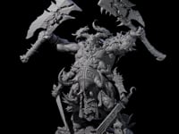 This imposing miniature captures the essence of demonic power, featuring intricate layered plate armor adorned with skull motifs and menacing spikes. The creature's muscular frame and aggressive stance showcase dual-wielded jagged axes raised in challenge, while its horned visage bears a fierce expression. The detailed base, littered with broken weapons and battlefield debris, provides a dynamic foundation for this formidable figure. Essential for epic encounters, this highly detailed sculpt offers painters and collectors a stunning centerpiece that commands attention on any tabletop.