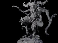 This imposing Goristro fiend commands attention with its unique four-armed design, each limb alternating between curved blades and a ceremonial drum. The miniature captures the creature mid-leap, supported by powerful goat-like legs, while its horned head bears a snarling expression that perfectly conveys its savage nature. Anatomical details include exposed ribs and varied textural elements across its organic form. The detailed round base, adorned with broken structures and scattered debris, provides a stable foundation for this dynamic pose.
