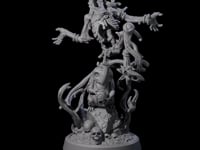 This detailed humanoid miniature captures the distinctive avian features of the Kenku race, with an emaciated form draped in flowing, weathered vestments. The figure's extended arms and elongated fingers create a commanding presence, while its gaunt, prominent features emphasize its shamanic nature. The circular base features intricate detail work, with sculpted roots or tendrils rising to embrace the hovering form, complemented by carefully placed stones and ritual objects that enhance the mystical atmosphere.