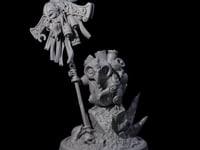 This detailed humanoid miniature captures the distinctive avian features of a Kenku, with an elongated form and hunched posture that emphasizes their mysterious nature. The figure wears an intricate mechanical backpack adorned with pipes and circular components, while wielding a ceremonial staff crowned with an elaborate mask-like ornament. Their slender limbs and exaggerated features, complete with what appears to be ritual goggles, create a unique silhouette. The miniature stands atop a detailed base featuring rocky terrain and scattered debris, perfect for tabletop encounters or display.