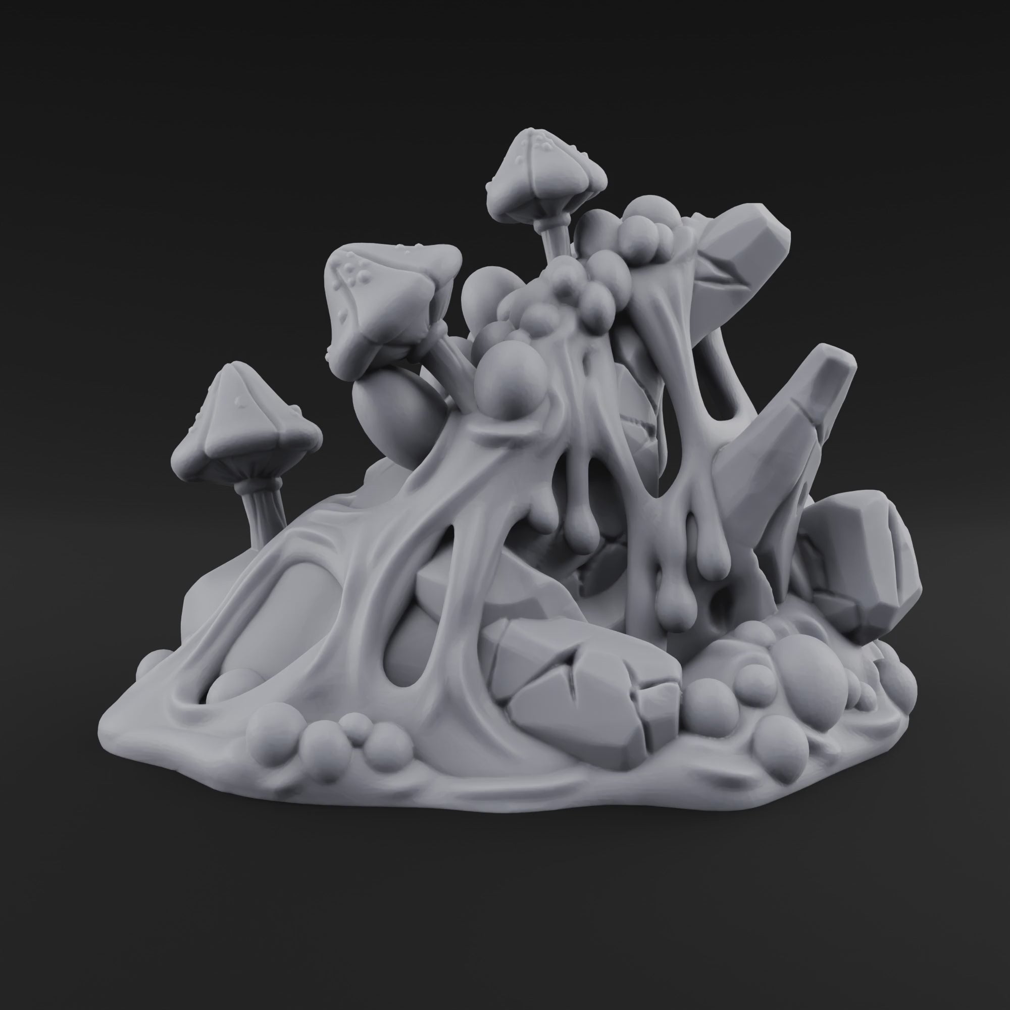 A grotesque eruption of bulbous fungi, creeping slime, and jagged crystal formations burst from a mound of organic decay. Thick tendrils of ooze drip between oversized mushroom caps while clusters of spore-pods cling to every surface, giving this piece a wonderfully repulsive texture that begs to be painted in sickly greens, purples, and iridescent highlights. Standing 4.2 cm tall and printed in high-detail resin, this single-piece scatter terrain captures the alien menace of a subterranean ecosystem gone horribly wrong.