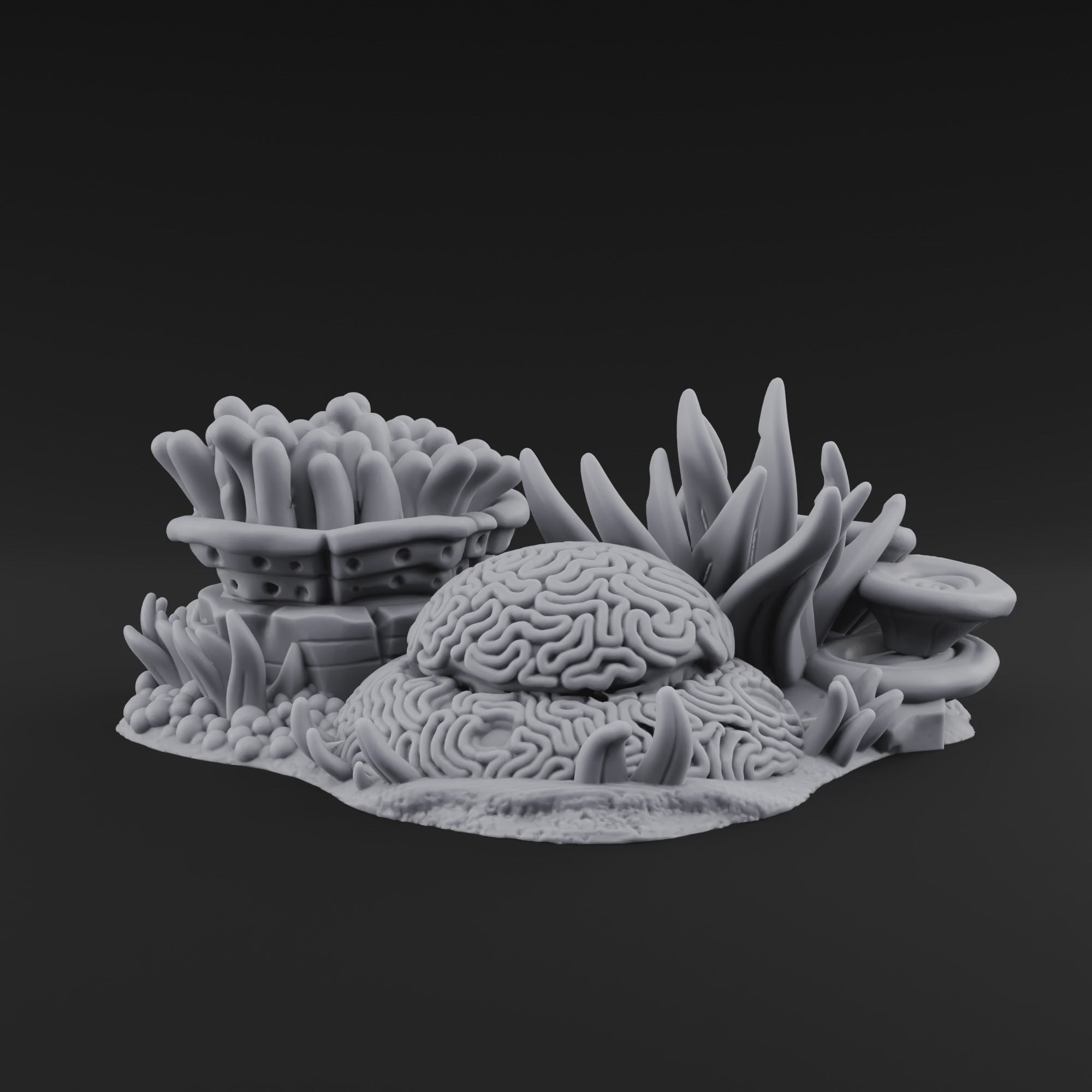 Something alien and beautiful rises from the ocean floor. This stunning scatter piece features a dense cluster of coral formations — bulbous brain coral at the centre, ringed by jagged fire coral blades, delicate tube sponges, and coiling sea whips. Every surface is packed with organic texture: the hypnotic labyrinthine ridges of the brain coral, the porous lattice of the sponge colony, the sharp upward thrust of the staghorn fronds. 3D printed in high-detail resin and shipped unpainted, this piece rewards a creative paintjob with spectacular results — imagine vibrant teals, magentas, and ochres bringing this reef to vivid life.