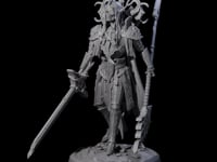 This miniature tells the story of a powerful lich, a master of necromancy and arcane arts, who has risen from the depths of forgotten crypts. Its skeletal hands grasp a runic-inscribed longsword and a staff topped with a scythe-like blade, hinting at its mastery over life and death. Its menacing pose suggests a readiness to advance, bringing dread and destruction to all who dare challenge it.