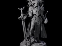 The story of the Creaking Tomb Lich C is one of ancient power and dark influence. As a necromancer of unparalleled skill, he wields an enormous, ornate staff topped with a menacing, beaked creature, a symbol of his control over dark forces. His raised left hand, with a spectral flame flickering from his palm, showcases his mastery over powerful magical energies. This lich's skeletal visage, complemented by a crown-like headpiece, accentuates his undead nature, making him a formidable adversary in any campaign setting.