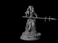 This detailed humanoid miniature captures the essence of a fallen celestial being, featuring elaborate layered robes and flowing fabric that drapes dramatically from the arms and shoulders. The gaunt figure wears an intricate headdress that partially shrouds their face, adding to their mysterious presence. The sculpted rocky terrain base provides a stable foundation for this commanding figure, perfect for roleplaying scenarios or display.