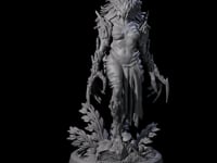 This detailed fey miniature captures a Dryad warrior in a commanding stance, arms outstretched in a display of natural might. The figure features intricate organic armor adorned with jagged elements and imposing spiked extensions rising from both head and shoulders. Notable details include elongated claws and bark-textured surfaces across the form, complemented by flowing cloth elements that wrap elegantly around the waist and legs. The sculpted base brings the forest setting to life with detailed foliage and natural terrain elements, perfect for tabletop encounters or display.