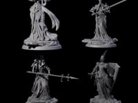 Each humanoid figure showcases unique martial prowess: one proudly bears a flowing banner, another wields a mighty two-handed sword with a crown-like headpiece, the third balances a formidable double-ended polearm, while the fourth stands defensive with sword and shield. Their attire ranges from flowing robes to ornamental armor, complemented by elaborate headwear that hints at their divine lineage. Each miniature rests upon detailed rocky terrain, perfect for tabletop gameplay or display.