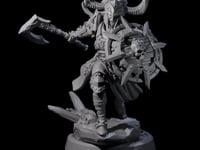 A formidable human warrior stands ready for battle, her imposing presence amplified by skull-adorned battle gear and a spiked horned helmet.