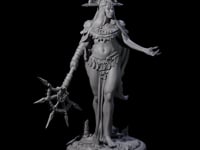 This highly detailed miniature captures a female human figure in ceremonial regalia, featuring an elaborate spiked headdress and ornate jewelry that marks her authority. The sculpt showcases her commanding pose with one arm extended in proclamation while wielding a formidable spiked mace. Her attire includes a flowing cape and ritualistic loincloth garment, with every fold and decoration meticulously rendered. The detailed base features jagged terrain elements that enhance the miniature's dramatic presence.
