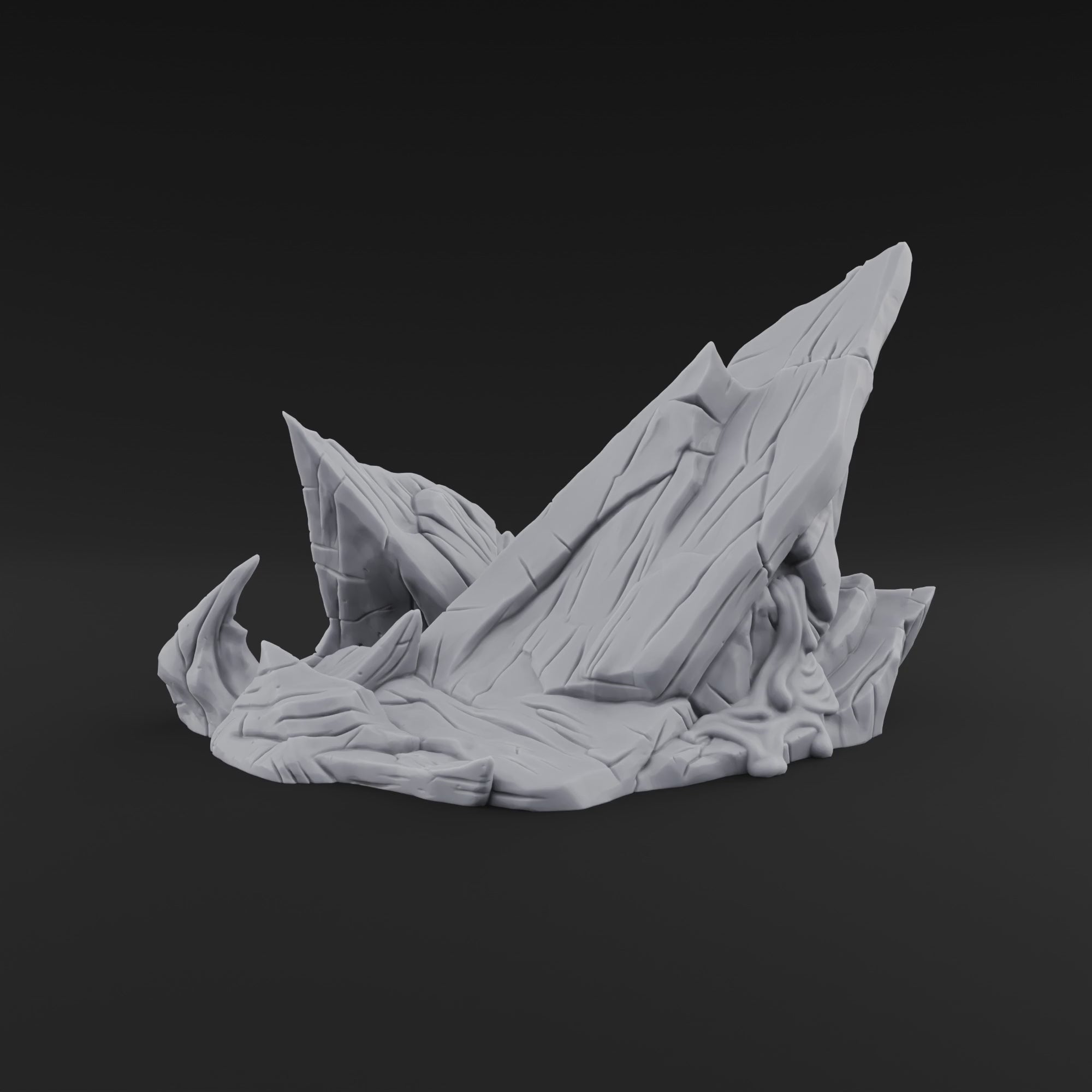 Sharp, fractured rock juts skyward from a base of cracked and flowing stone, every surface etched with deep fissures and brutal geological texture. Standing 5.3 cm tall, this volcanic outcrop captures the violent beauty of a landscape torn apart by tectonic fury — horn-like spurs of stone curling from the base like the earth itself is clawing upward. 3D printed in high-detail resin, the piece arrives as a single unpainted element ready for your brush, whether you envision obsidian black, sulphur-streaked yellow, or glowing magma in every crevice.
