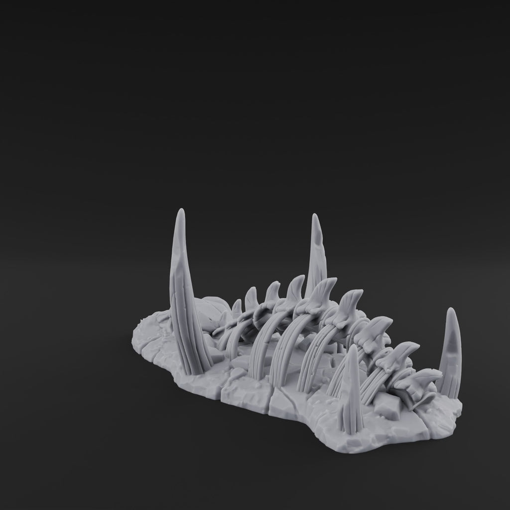 A massive ribcage juts from the cracked earth, the bleached bones of some long-dead leviathan half-swallowed by the wasteland. Towering horn-like spines pierce the sky while weathered ribs curve inward like the bars of a cage, every surface textured with the erosion of ages. At just 5.7 × 6.2 cm with spines reaching 3 cm tall, this single-piece scatter terrain commands attention far beyond its footprint. 3D printed in durable PLA and arriving unpainted, the crisp detail rewards drybrushing and washes beautifully.
