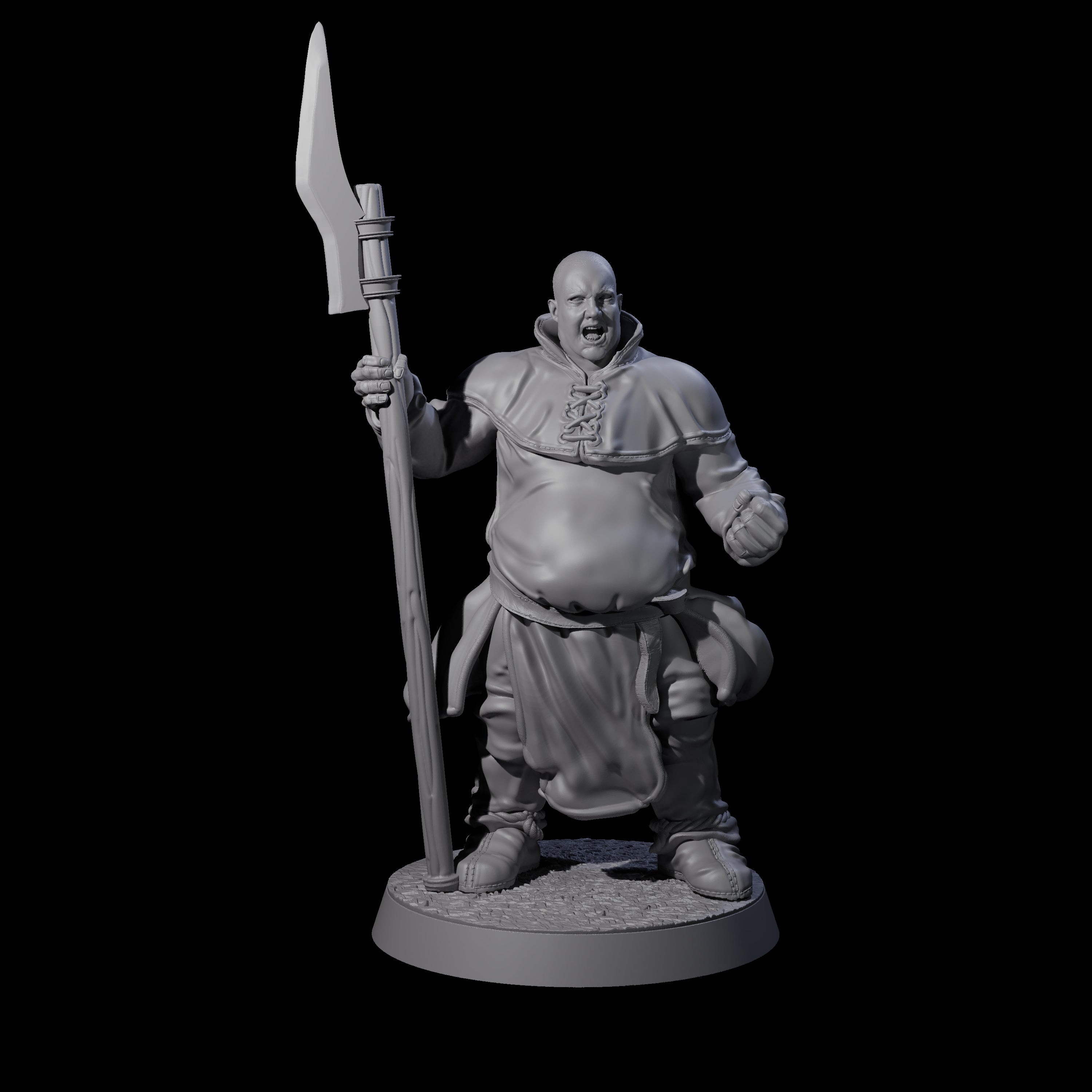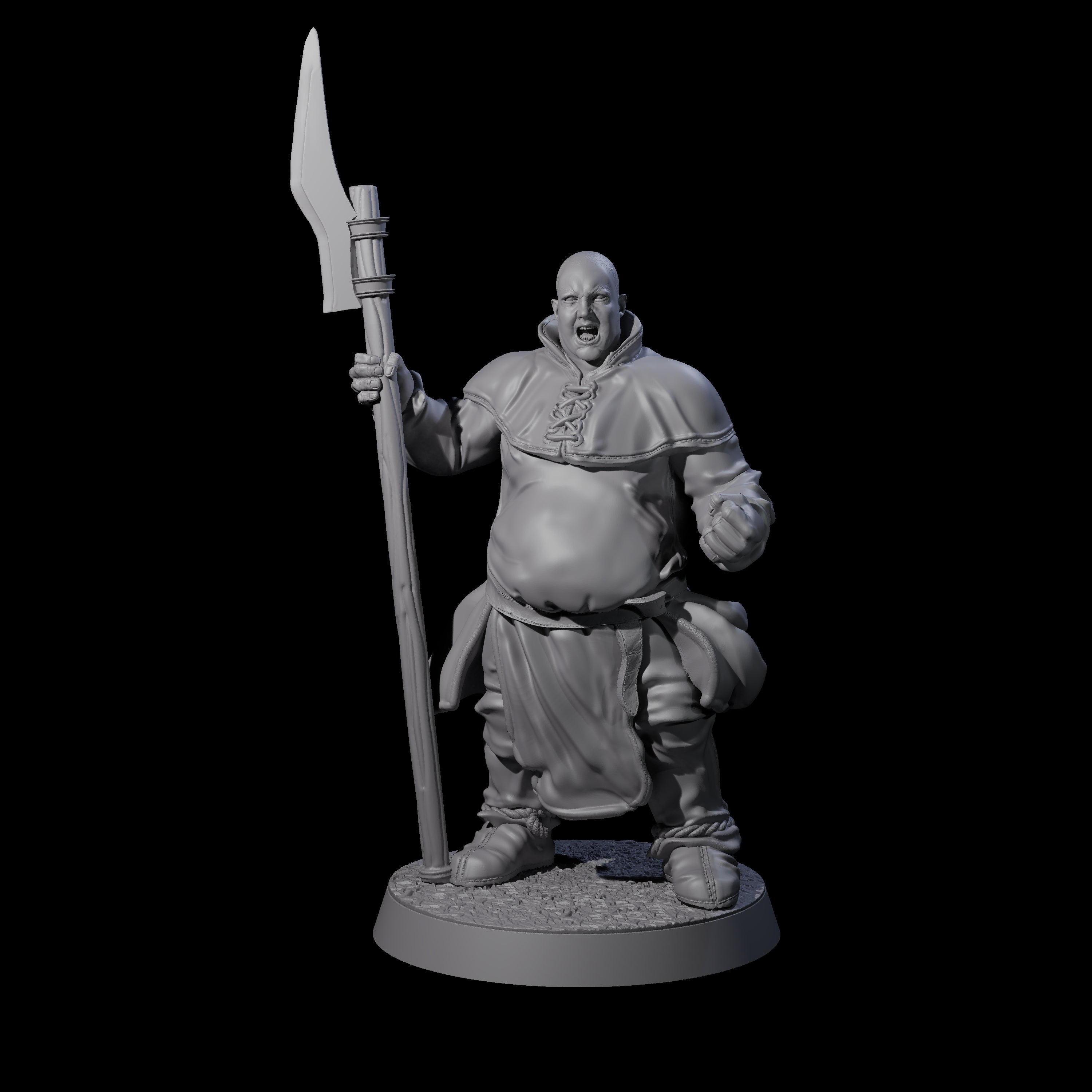 The Brave Peasant Soldier A miniature is a captivating representation of raw courage and determination. Standing at 25mm tall, this figurine showcases a human male figure in a dynamic pose, embodying the spirit of a steadfast warrior. The soldier holds a long spear with a leaf-shaped blade, gripped firmly in both hands, ready to face any adversary. His simple, rugged clothing speaks of his humble peasant origins, but practical battle-ready additions like reinforced padding and a protective cloak ensure he is well-prepared for the fight. His bald head and fervent expression of determination, with an open mouth as if shouting commands or rallying allies, add to his commanding presence on the battlefield.