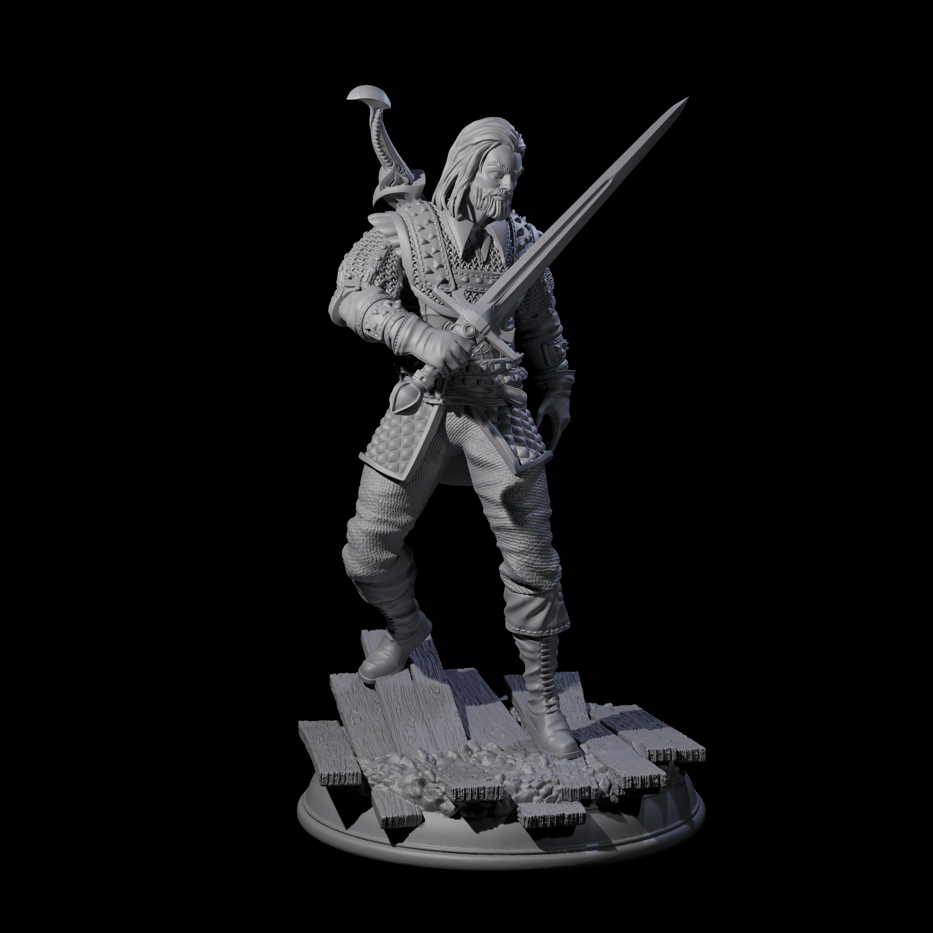 This cautious human fighter miniature brings a sense of readiness and strategy to any tabletop RPG campaign, whether in Dungeons and Dragons, Pathfinder 2E, or any other fantasy setting. Armed with a longsword, this seasoned warrior is prepared for any challenge ahead, his stance suggesting both vigilance and caution. His detailed armor, layered with quilted padding and chainmail, reflects a well-prepared fighter who relies on both skill and defense in combat.