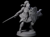 Meet City Knight E, a stunning miniature that captures the essence of a valorous human knight in the heat of battle. This exquisitely crafted figure is adorned in detailed full plate armor, complete with a crested helmet featuring a distinctive flowing plume. Every inch of the armor is intricately designed, conveying an aura of prestige and high status. The knight stands poised for combat, with a longsword ready to strike and an ornately decorated shield providing steadfast protection. The billowing cape adds a dynamic sense of motion, as if caught in the midst of a fierce gust of wind on the battlefield.