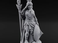 This noble paladin embodies divine grace and martial prowess, her ornate helm crowned with sacred wings. She grips a leaf-wreathed spear while her decorated shield bears mystical symbols of protection. Her flowing robes and confident stance speak to unwavering faith and righteous purpose. Perfect for holy quests and crusades against darkness.