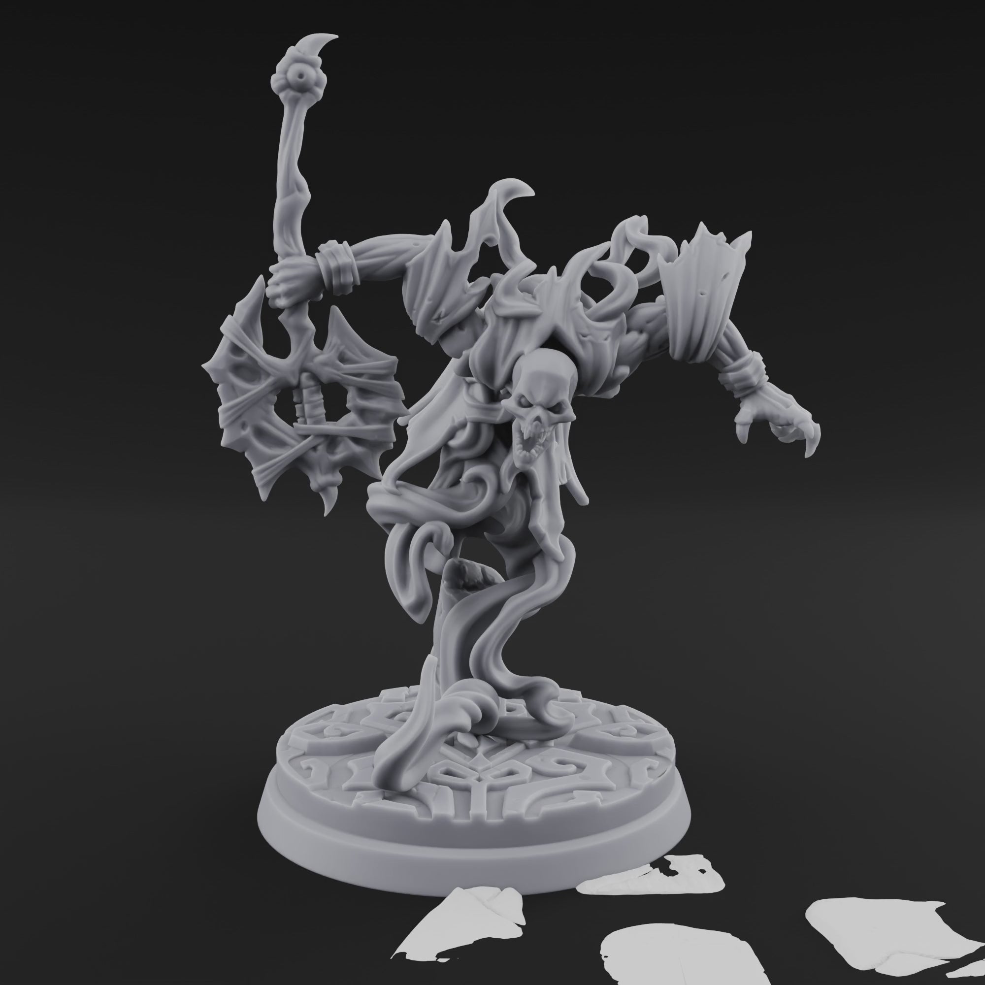 This malevolent specter surges forward with terrible purpose, a massive cursed war-axe raised high overhead as tattered robes and writhing tendrils of ectoplasm trail behind it. Its skull-like face leers downward with hollow, predatory malice, framed by coiling spectral tendrils that dissolve into the ornate arcane seal beneath its hovering form. Every element of this sculpt radiates violent supernatural energy — from the razor-sharp axe detail to the fluid, weightless dynamism of a creature unbound by gravity.