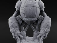 Towering on crude wooden stilts, the Barrel Golem is a patchwork monstrosity of lashed casks, iron rivets, and splintered timber. Its massive barrel-fist arms hang low, bound tight with coiled rope, while smaller kegs bristle from its hunched shoulders like grotesque growths. A central cask forms its torso, branded with a spiraling rune that hints at the crude enchantment animating this tavern-born terror.