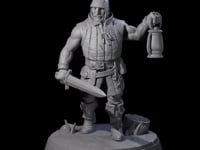 This detailed miniature captures a militia member in full readiness, featuring a practical combination of sleeveless vest over a shirt with rolled sleeves, and sturdy trousers tucked into boots. The figure maintains a defensive stance, short sword at the ready while holding a lantern aloft. Fine details include a stern, bearded face beneath a hood, and a characterful base featuring a tree stump and foliage that adds environmental context. Perfect for representing town guards, civilian militia, or watchmen in tabletop roleplaying scenarios.