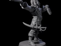 Every pirate has a story, and this miniature tells a tale of bold escapades and daring exploits. With his left hand triumphantly raising a bottle and his right hand firmly gripping a long pistol, this pirate is always prepared for action. The curved cutlass resting at his hip suggests readiness for both gunplay and sword fighting, making him a versatile character in any seafaring campaign. His posture and expression exude the swagger and boldness that define a true swashbuckler.