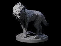 Introducing the Cunning Dire Wolf, a meticulously crafted TTRPG miniature that embodies the raw power and majesty of this mythical predator. Its robust and muscular form suggests an agile and powerful beast, ready to strike at a moment's notice. The intricate detailing of its fur, particularly around the neck and shoulders, adds to its imposing presence, while the bristling texture conveys an air of ferocity. With a dynamic forward-facing pose and one paw slightly lifted, this dire wolf seems to be stalking its prey or preparing to spring into action.