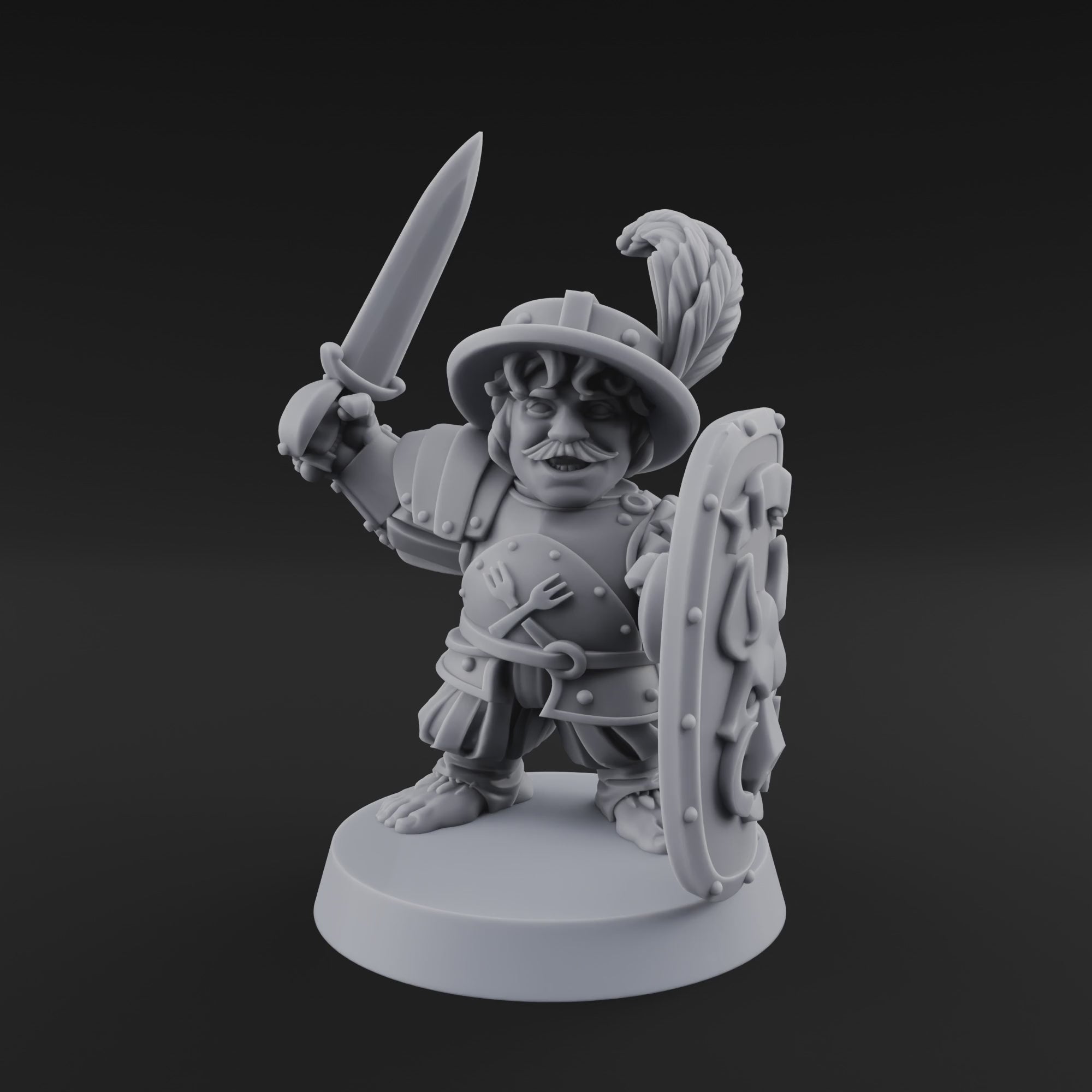 Sword raised high and battered shield braced for impact, this stout halfling warrior charges into battle with a rakish grin beneath his plumed wide-brim hat. Every detail rewards close inspection — from the riveted plate armor and the fork tucked into his belt (priorities, after all) to the ornate shield boss and his wonderfully expressive bare-footed stance. The sculpt radiates scrappy, defiant energy that practically leaps off the base.