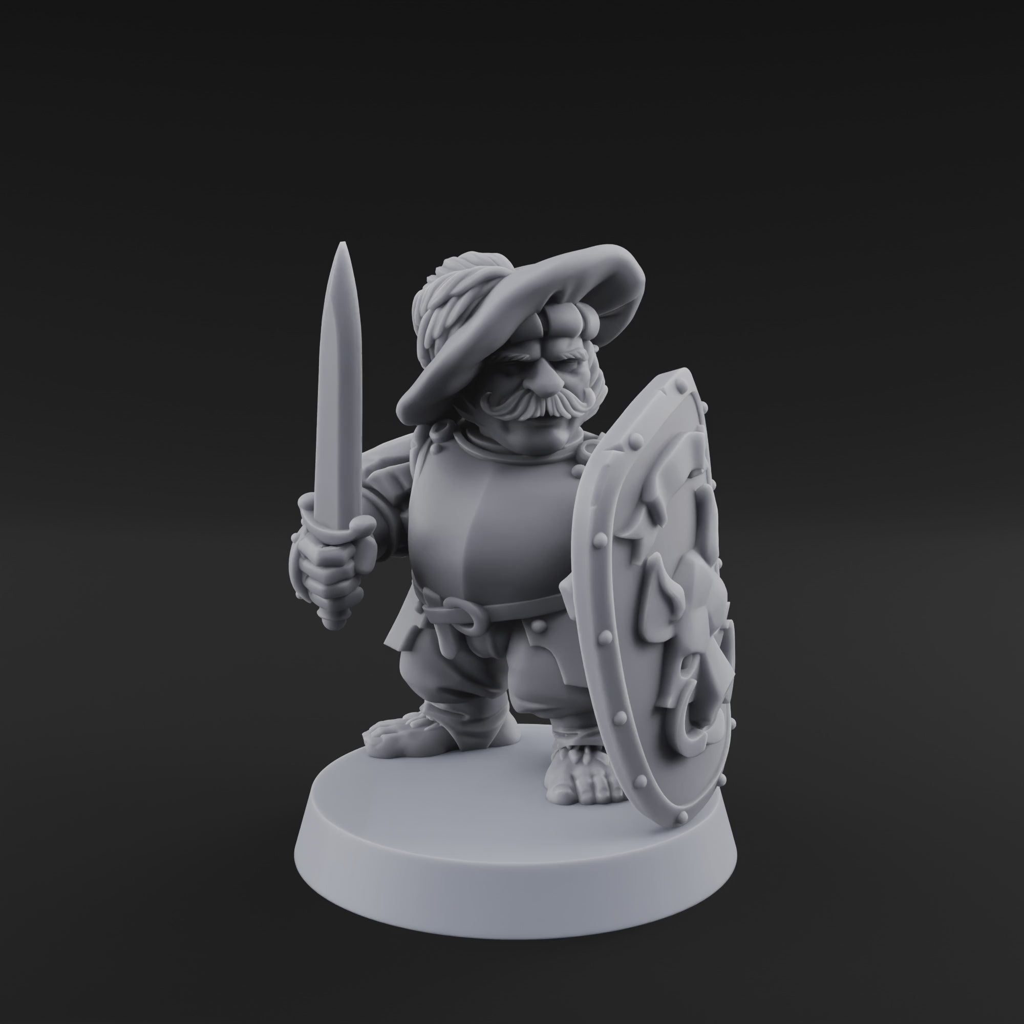 Feet planted and sword at the ready, this halfling warrior stands his ground with the quiet confidence of a veteran who's seen worse. A broad-brimmed hat shades weathered features and a thick, bristling moustache, while his battered shield — adorned with ornate riveted detailing — tells the story of a dozen skirmishes survived. The sculpt captures beautifully crisp texture across every surface, from the worn leather of his breastplate to the calloused grip on his shortsword.