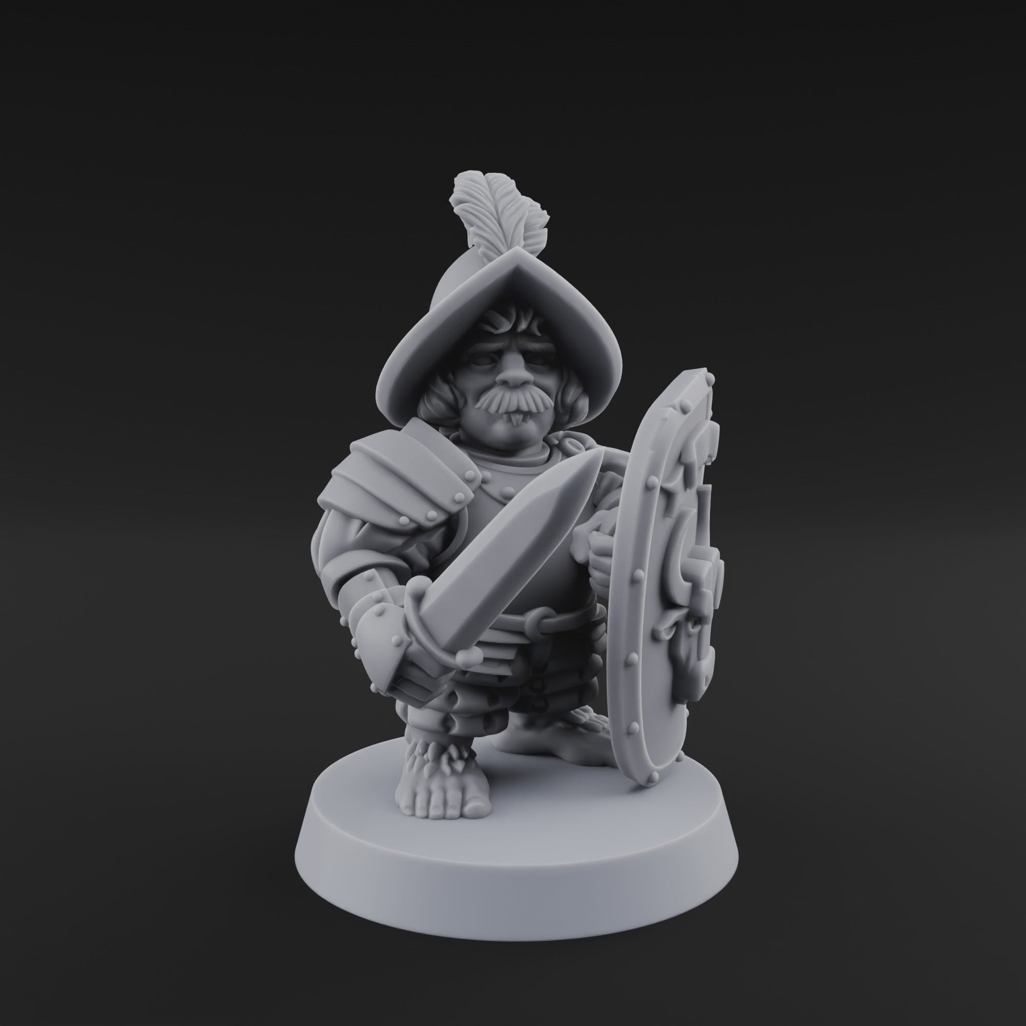 Braced low and ready for the worst, this stout halfling warrior peers out from beneath a plumed wide-brim hat with grim determination. Heavy layered plate covers his shoulders and arms while a riveted round shield stands planted at his side, sword gripped tight and angled forward in a posture that says he's not moving an inch. Every rivet, buckle, and crease in his armor is rendered with razor-sharp detail that rewards close inspection and makes painting an absolute joy.