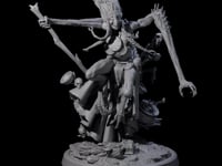 This highly detailed miniature captures a muscular hag in a dynamic stance, one foot raised upon rocky terrain. Multiple horns crown her head, while clawed hands grip an intricate stringed instrument. The figure's exaggerated facial features include an open mouth, suggesting a haunting performance. Ornate accessories, including a tribal necklace and ceremonial loincloth, adorn the creature. The sculpt achieves fantastic movement through flowing hair and a swirling cloak, creating a striking tabletop presence perfect for RPG encounters or display.