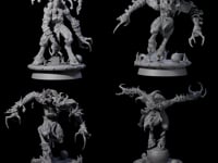 This haunting figure captures the essence of a demon jester with its hunched posture and aggressive stance. The detailed sculpt features elongated limbs ending in wicked claws, while twisted, branching horns crown its head. Muscular definition and textured limbs add character, complemented by tattered, draped clothing that enhances its menacing presence. The circular base tells its own story with scattered debris, including a broken shield and helmet, while a distinctive hole through its torso adds a supernatural element perfect for tabletop encounters.