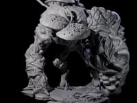 This imposing Myconid brute features an asymmetrical build with one oversized arm, perfect for conveying raw strength in combat scenarios. The creature's distinctive silhouette is defined by large mushroom growths adorning its back and shoulders, while its gnarled, organic texture and merged head create an otherworldly presence. The detailed base, complete with rocky terrain and small fungi, provides environmental context for this plant-based warrior. Each element has been carefully rendered to serve both painters and gamemasters seeking a unique encounter piece.
