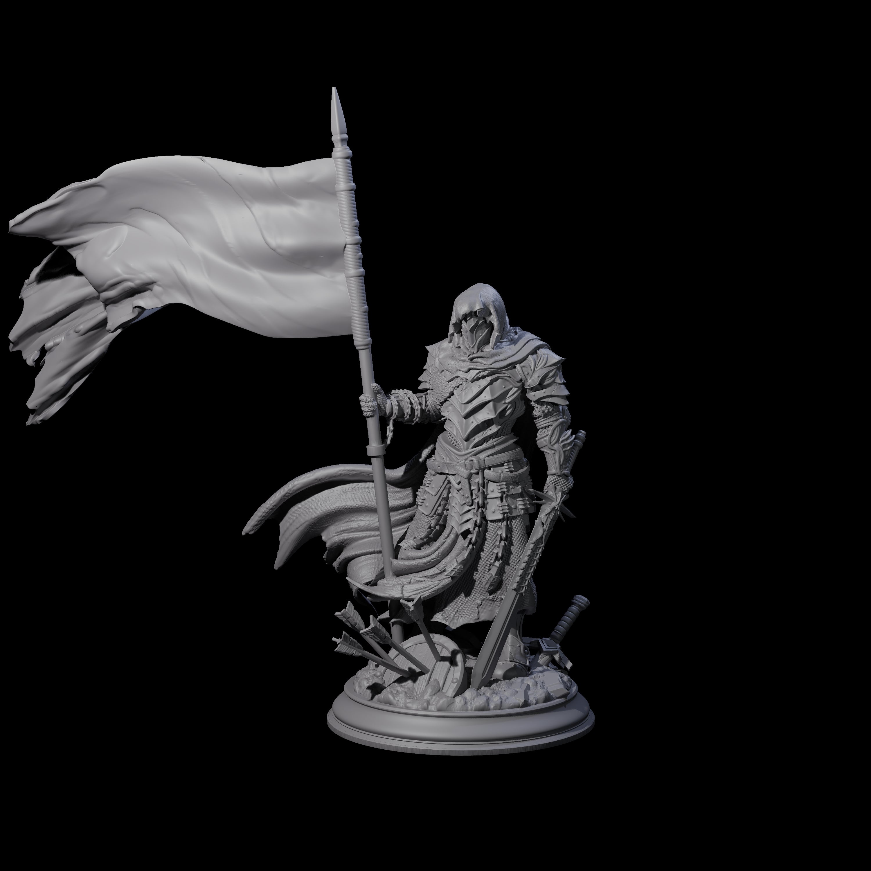 Clad in armor battered by countless battles, this victorious fighter stands tall, gripping a war-torn banner. The massive flag unfurls dramatically behind him, a symbol of his relentless spirit and the honor of his hard-won triumphs. His hooded visage and shadowed face lend an air of quiet intensity, while the ragged edges of his armor reveal the marks of an unyielding warrior who has faced foes beyond mortal reckoning. Perfect for Dungeons & Dragons, Pathfinder, or Call of Cthulhu campaigns, this miniature brings an inspiring yet gritty presence to any TTRPG battlefield.