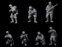 Seven battle-hardened riflemen stand ready for combat, each wielding bolt-action rifles with practiced expertise. Their field uniforms and steel helmets speak to military precision, while varied poses capture the tension of soldiers under fire. From advancing marksmen to kneeling shooters, this squad brings tactical realism to your tabletop battles.