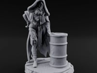 Taryne is a road-hardened scavenger wrapped in a heavy traveling cloak, her face lost beneath a deep hood. A gas mask hangs at her chest, hinting at toxic wastelands survived. She rests one hand on a dented fuel drum while the other grips a long blade, her legs wrapped in makeshift bindings and salvaged armor. Every detail speaks of resourcefulness, grit, and a world that demands both.