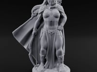 Standing tall with quiet confidence, this elven ranger carries a longbow at her side while a quiver of arrows peeks over one shoulder. Ornate pauldrons and a corset-style bodice hint at noble origins, while open sandals and flowing half-skirts speak to a life lived among wild trails. Her sweeping cloak billows dramatically behind her, and a decorative belt buckle adds a personal flourish to her woodland kit.