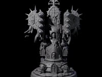 Rising from a fortified altar-platform, this augmented techpriest embodies the fusion of flesh and sacred circuitry. Multiple servo-arms bristle with arcane instruments while ornate spires crown his mechanized form. Gothic archways and religious iconography blend seamlessly with advanced technology, creating an imposing figure of digital divinity.