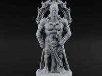 This imposing asura stands with arms planted at his hips, radiating raw dominance and barely restrained fury. A flaming mandorla arcs behind him like a halo of damnation, crowned with a ritual blade. Heavy prayer beads drape across his massive chest, while a snarling oni buckle anchors tattered vestments at his waist. Every sinew speaks of ancient, unyielding power.