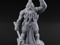 Bare-chested and bristling with muscle, this mohawked slayer hefts a massive war axe in one hand while thrusting a clenched fist skyward in brazen challenge. A thick braided beard cascades over his barrel chest, and a heavy belt cinches a loincloth between sturdy, boot-wrapped legs. His snarling expression and fearless stance speak of oaths sworn in blood and grudges yet to be settled.