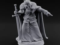 Wild-eyed and screaming, this deranged king grips a massive greatsword planted at his side while thrusting a condemning finger toward some unseen offender. A spiked crown sits atop a mane of unkempt hair, and a heavy fur-collared cloak billows behind his flowing robes. A starburst clasp and studded belt hint at faded grandeur swallowed by madness.