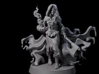 Introducing the Vampiric Red Riding Hood, a captivating 25mm miniature that brings a dark twist to a beloved fairy tale character. This intricately designed figure embodies a gothic aesthetic with her sinister grin revealing sharp fangs, hinting at her vampiric nature. The dramatic hooded cloak she wears flows with dynamic, tattered edges, creating an impression of movement and mystery. Beneath the cloak, her attire, detailed with buttons and layers, suggests a medieval or fantasy setting, enhancing her enigmatic presence.