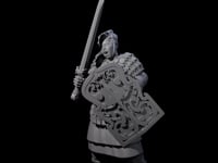 Ancient guardian awakened with ornate shield and deadly blade raised for eternal battle.